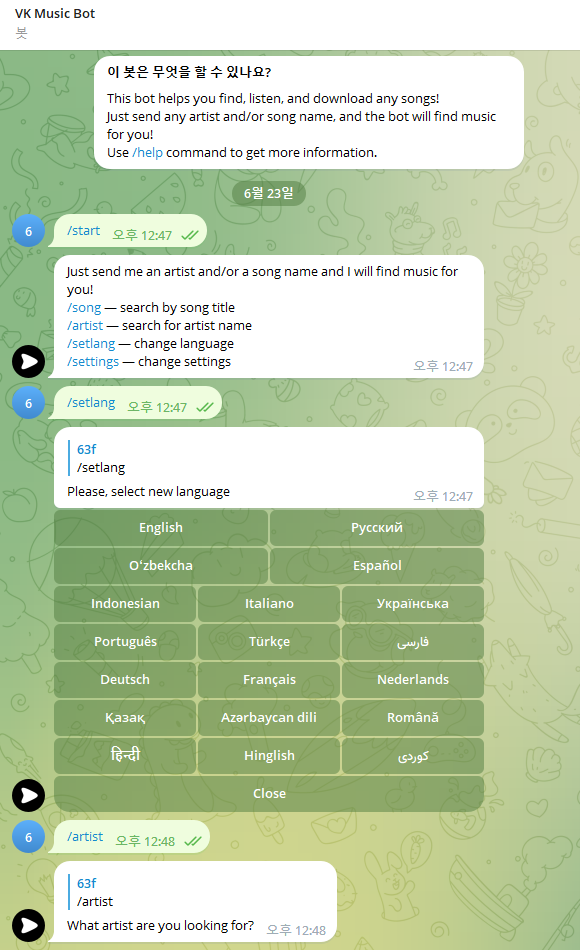 아래는 파이썬 decorator 로 구현하여, 명령어 (command) 별로 Bot 의 응답(동작) 을 제한 합니다.