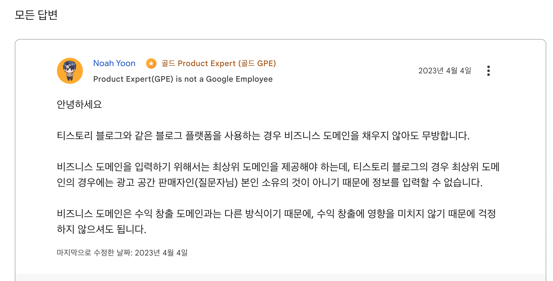 ( "구글 애드센스 > 계정 > 계정정보 > 판매자 정보 공개 상태 > 비지니스 도메인" )