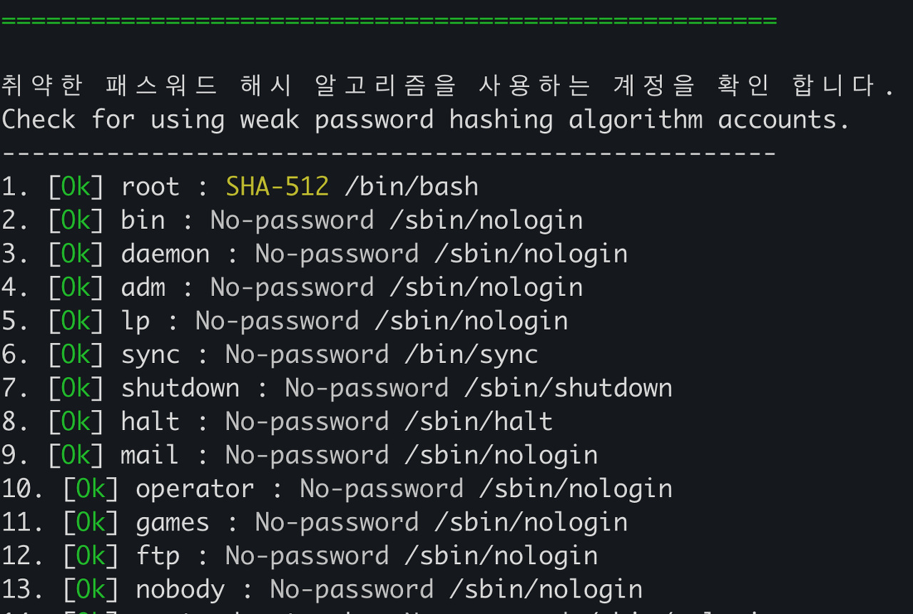 4.패스워드 해시가 MD5 인 계정은 패스워드를 재 변경하고, 시스템에서 MD5 해시를 만들어 내고 요소를 찾아서 조치 해야 합니다.